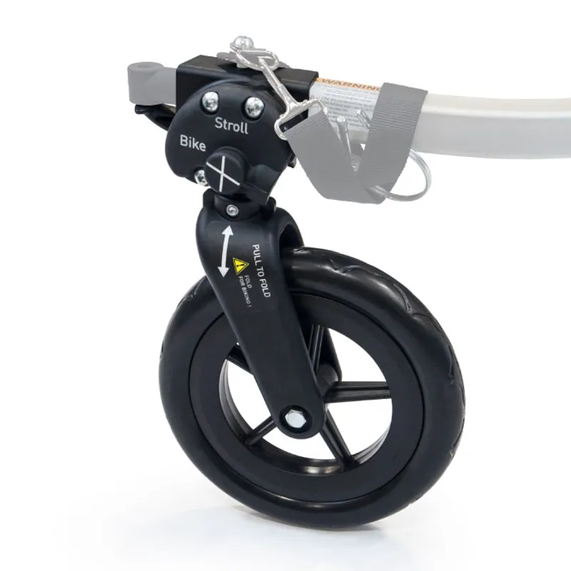 - Stroller wheel stays attached and folds up out of the way when cycling