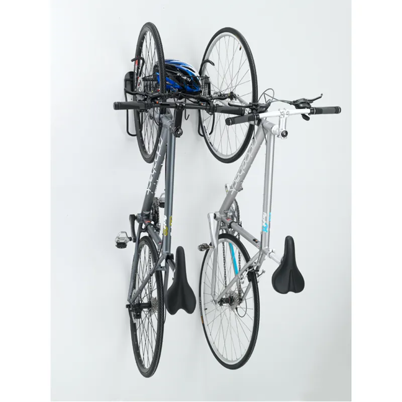- Mounts onto a wall, and holds two bikes in the vertical position