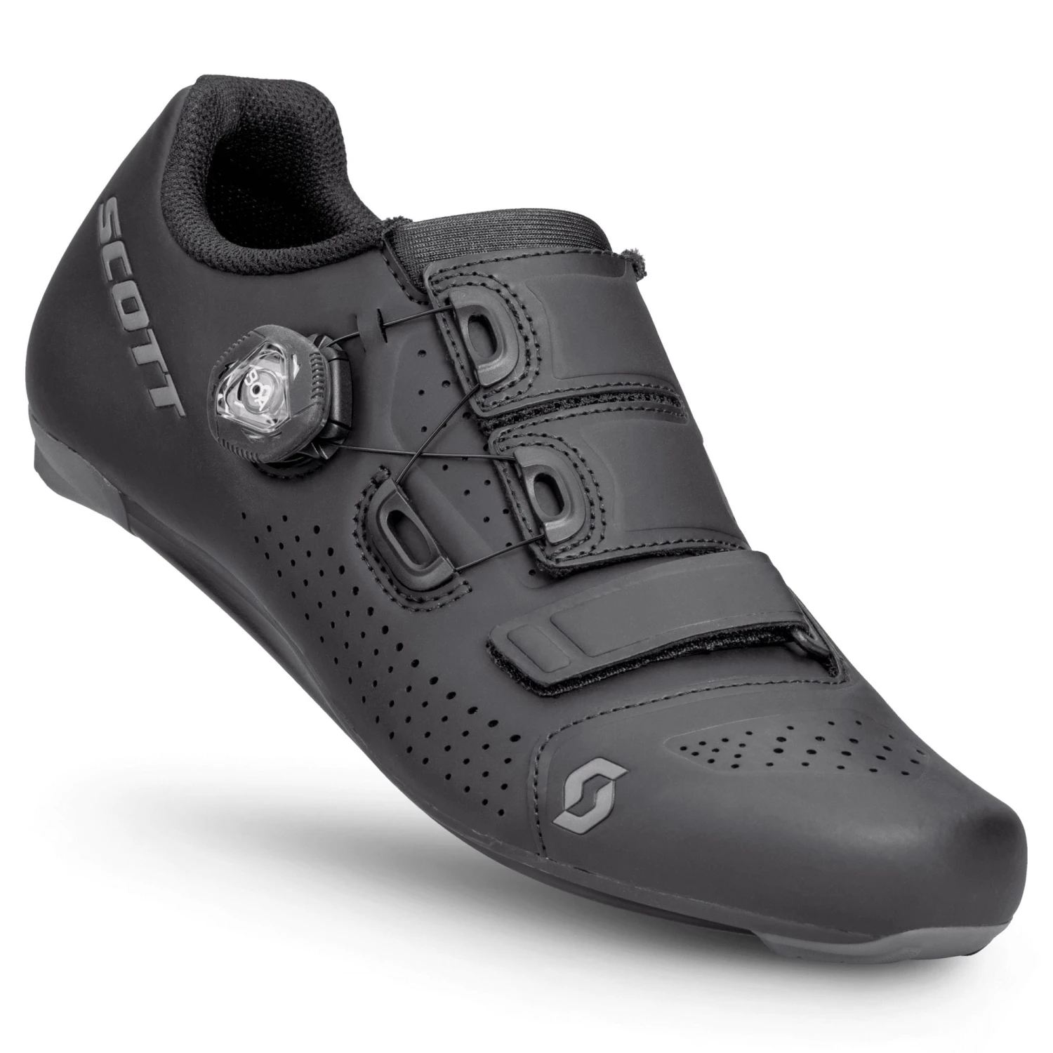 Performance-oriented cyclists will find the SCOTT Road Team BOA® to be a perfect shoe for serious pedaling response and long-distance comfort. The shoe features a sleek, asymmetric, conforming microfiber upper and a close-fitting adaptive fit pattern with a BOA® IP1 Fit System at the top. Combined with a lower anatomic fit strap, it articulates to best fit the shape of the rider’s foot. For all-day sole support, the ErgoLogic insole features arch support and a metatarsal button. The injection composite sole has an increased range of cleat adjustment with a stiffness index of 8.